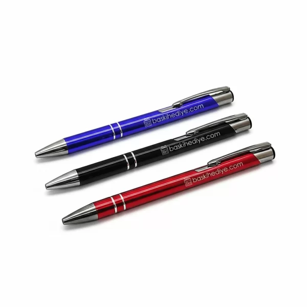 Metal tükenmez kalemlere lazer baskı (lazer markalama) yapılabilir. Bu yöntemde, metalin üzerindeki tabaka kazınarak altındaki malzeme ortaya çıkar ve kalıcı bir işleme yapılır. Renkli veya boyalı bir baskı değildir; ürünün gövdesine işlenir ve son derece dayanıklıdır.